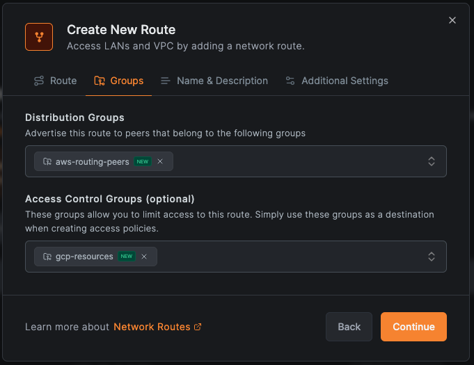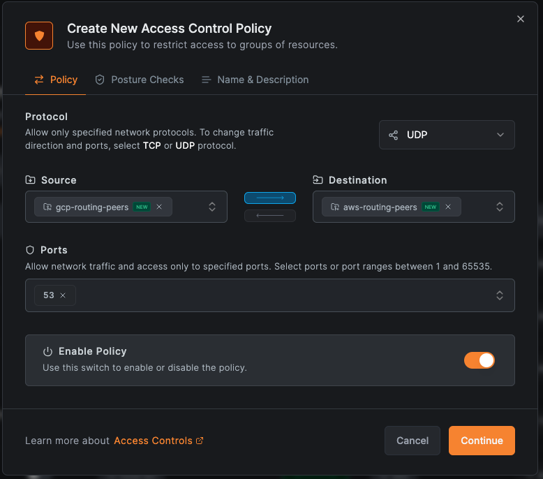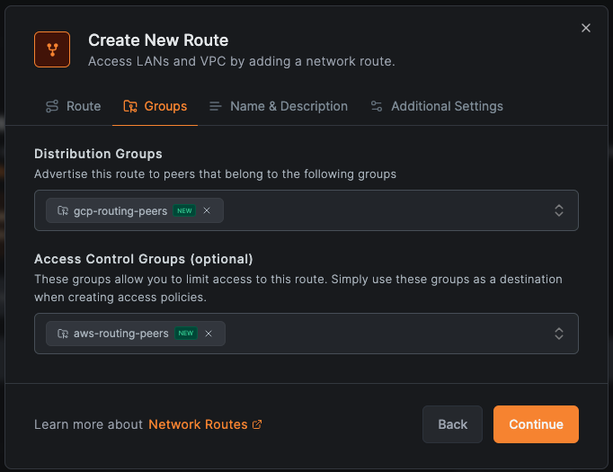 - Access Control Groups: "gcp-routing-peers" (required for route-level policies—this group becomes the destination in access policies; without it, policies targeting this route won't apply)