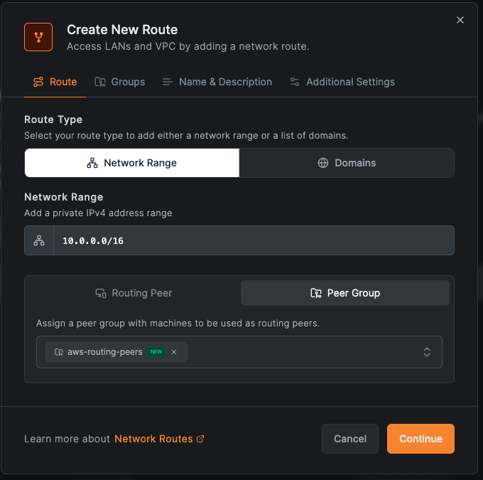 - Access Control Groups: "aws-routing-peers" (required for route-level policies—this group becomes the destination in access policies; without it, policies targeting this route won't apply)