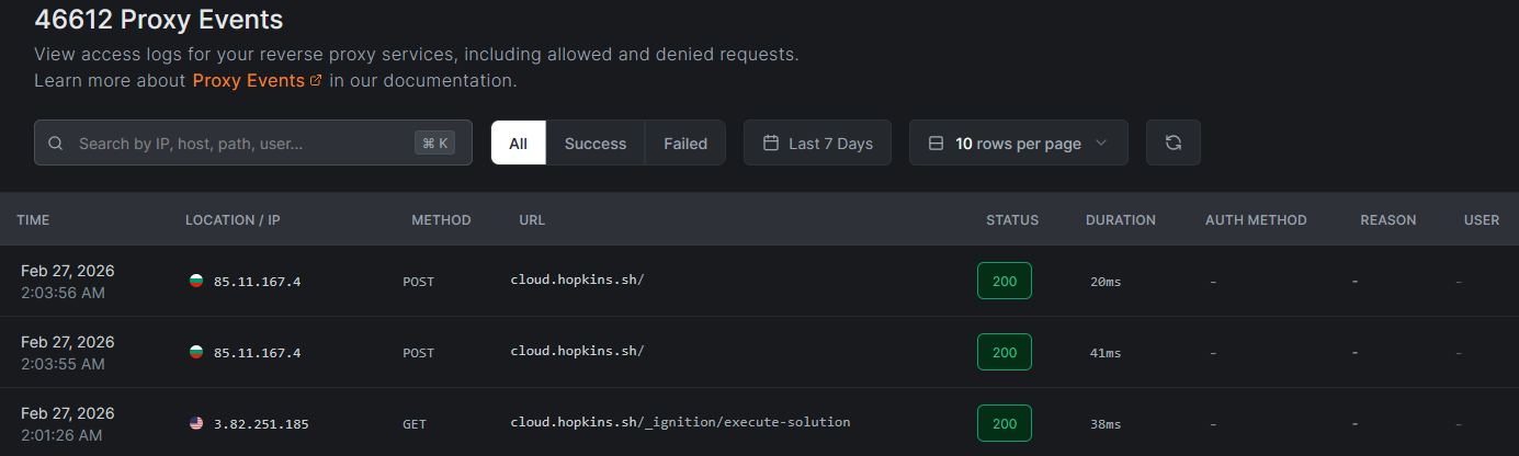 Access logs are available in the NetBird dashboard under Activity > Proxy Events. This view displays a table of all HTTP requests that have passed through your reverse proxy services, with filters to narrow down results by time range, status, or other fields.