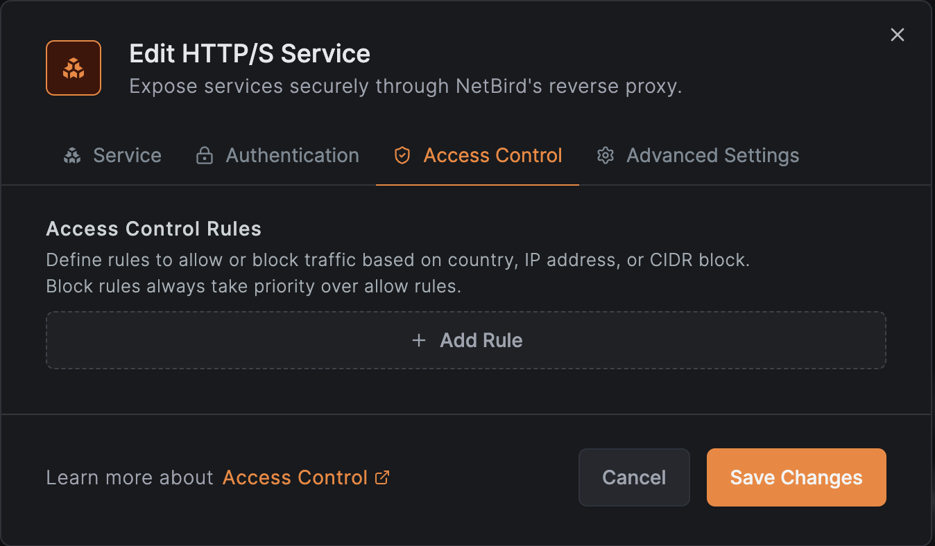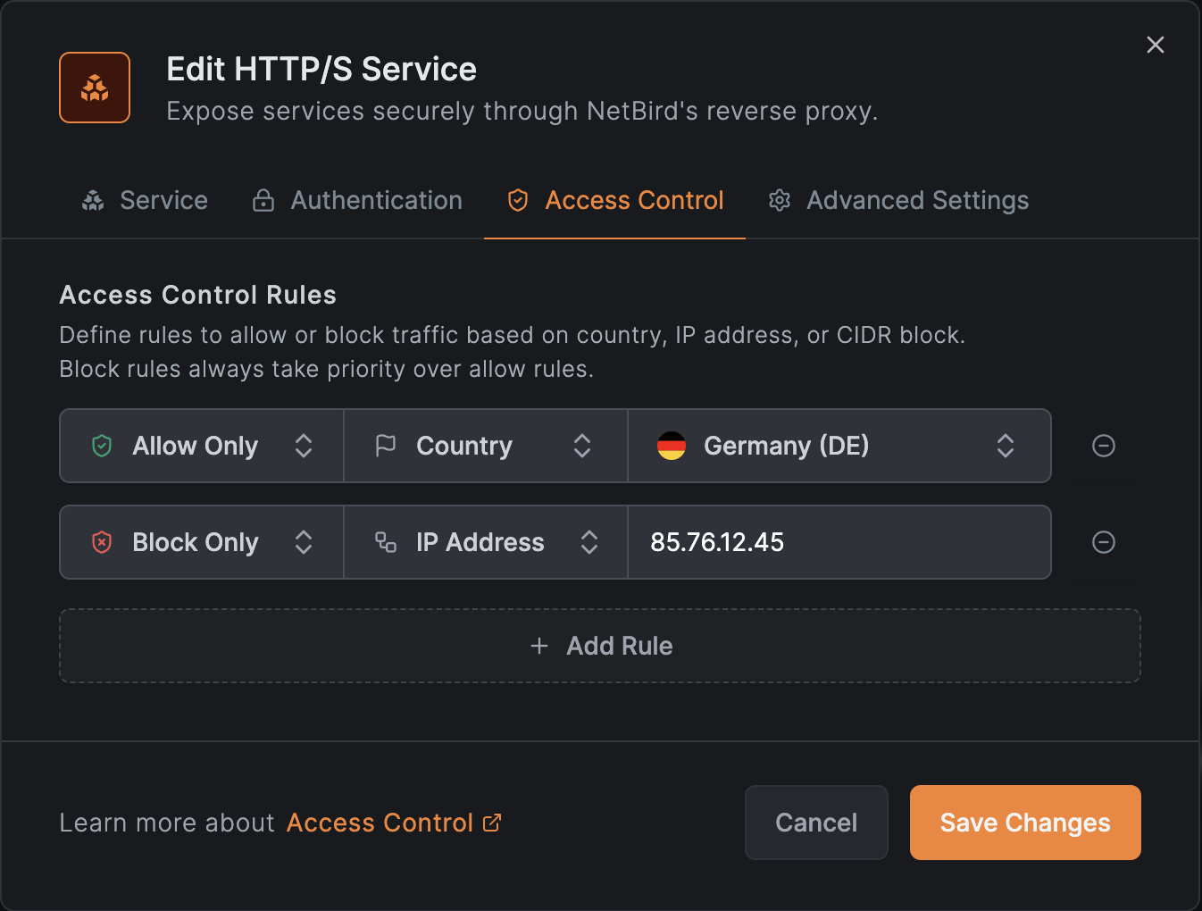 - Access Control tab (all service modes): IP CIDR and country restrictions
