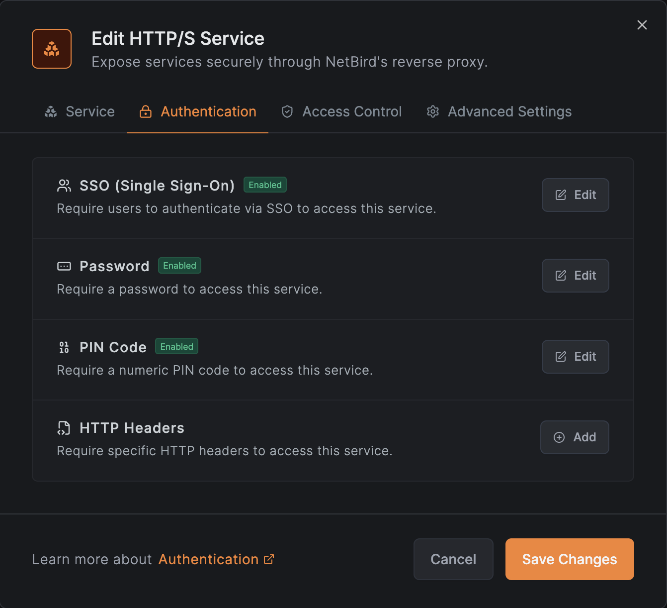 NetBird Reverse Proxy supports multiple authentication methods and connection-level access restrictions to control who can access your exposed services. You can enable one or more methods on each service, or leave a service completely public. Authentication and access restrictions are configured per service in the Authentication tab when creating or editing a service.