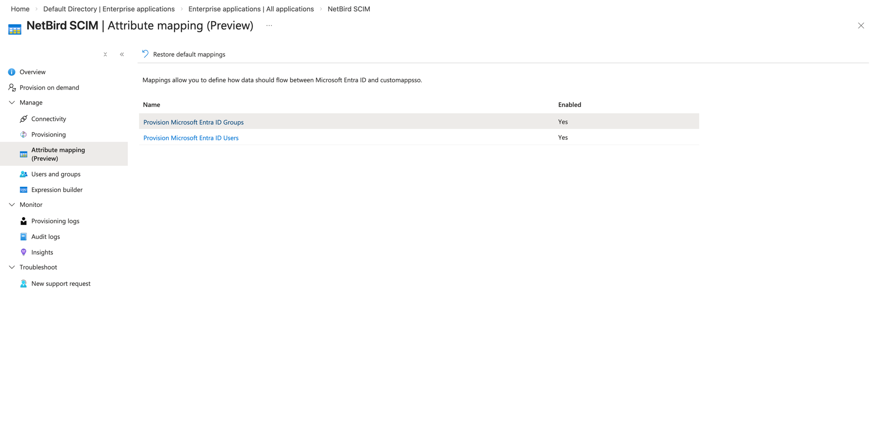 SCIM provisioning will manage only resources that are created through Microsoft Entra ID. Any resources created directly in NetBird will not be managed by SCIM.